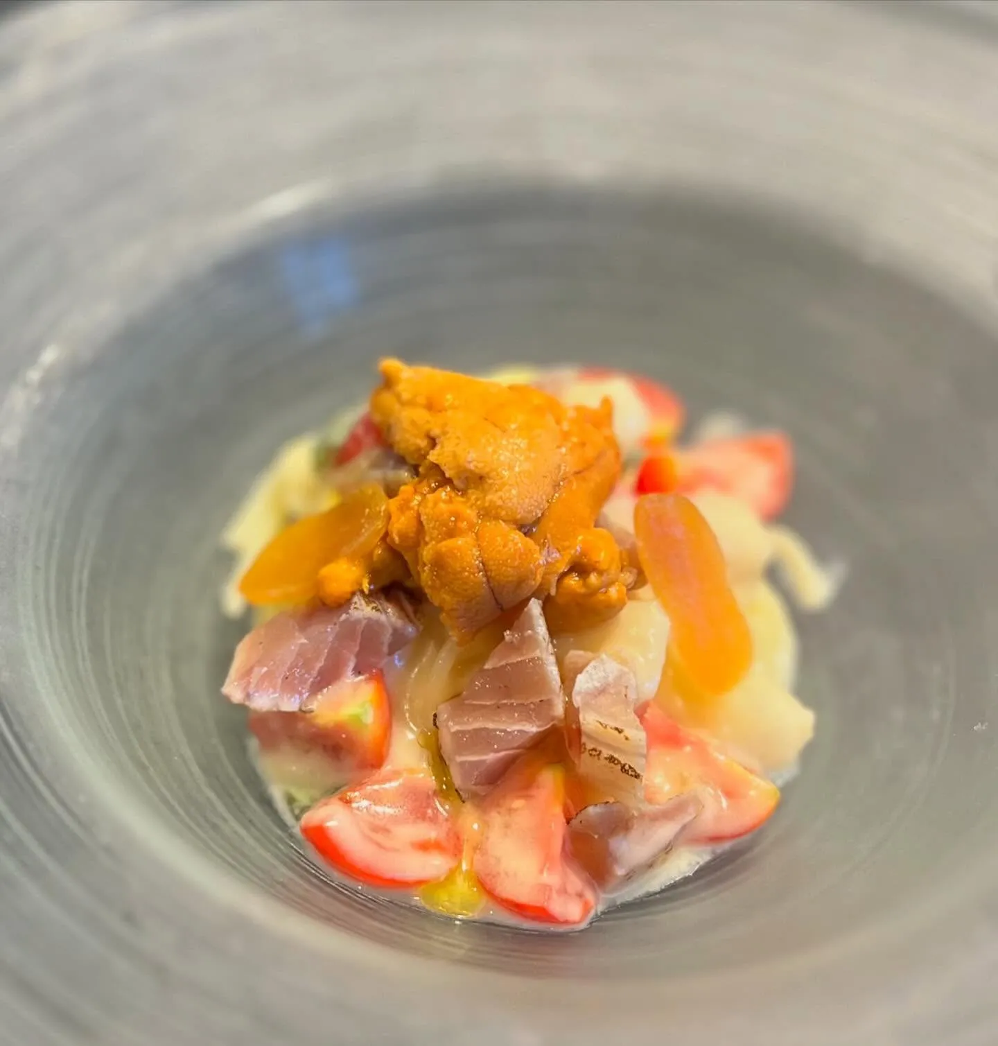 白鳳とカラスミ.炙り鮪と生ウニの冷製フェデリーニ