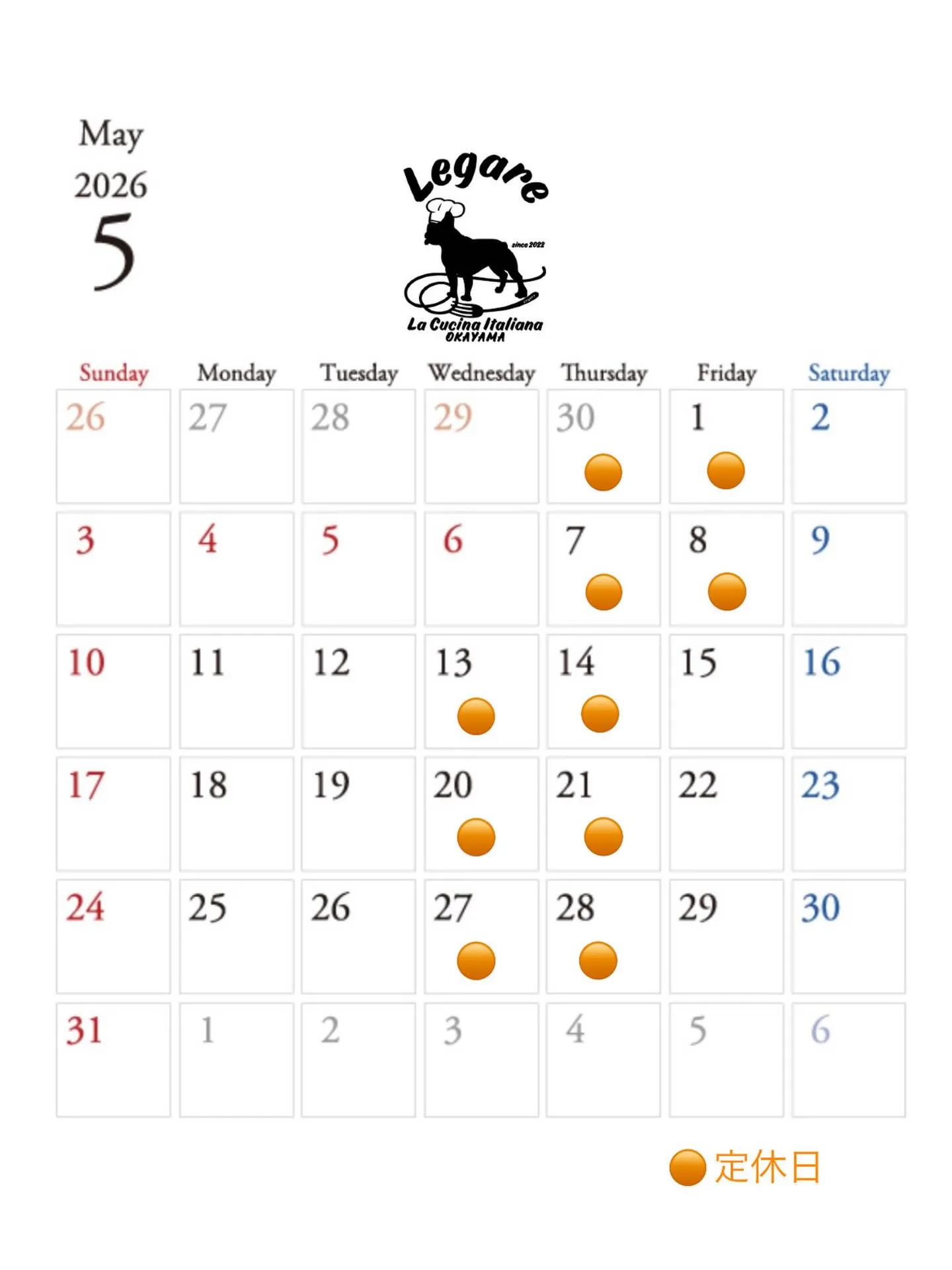 5月の営業日程🖐️